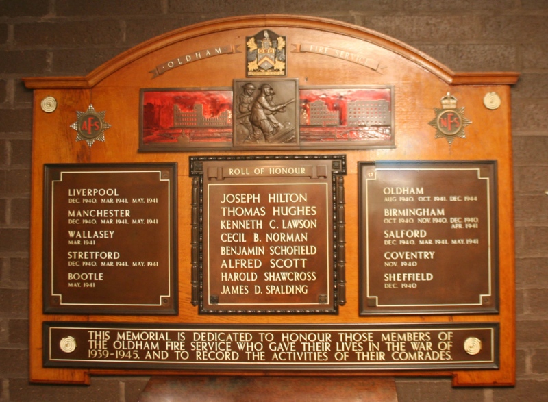 Of the eight firemen commemorated on this memorial, five of them died fighting fires at Trafford Park/Stretford during the Manchester Blitz on the 23rd/24th December 1940. Joseph Henry Hilton - 23/12/1940 at T/P Benjamin Schofield - 23/12/1940 at T/P James Dunkerley Spalding - 23/12/1940 at T/P Harold Shawcross - 24/12/1940 at Withington Hospital Thomas Hughes - 25/12/1940 at Withington Hospital (see also the Manchester F.B. Memorial) |