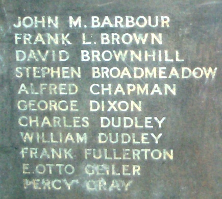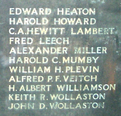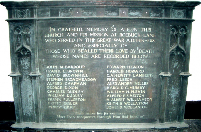 This memorial was in storage for years, unloved and out of sight. I wrote to the Minister asking whether this memorial (as you see it here) was ever going to be mounted within their relatively new church. I never got an answer to my letter, so telephoned the Minister, who was really not interested in it, in fact he said that I could have it if I wanted it. The church was obviously not proud of their parishioners who had made the ultimate sacrifice during WW1. Thankfully St. Paul's P.C. Springfield Road stepped in and sent it away for renovation and it is now proudly displayed in that Church. They made a superb job of renovating it and it is almost unrecognisable compared to these images here. St. Paul's P.C. also took their Church Sunday School War Memorial, that was originally on display on the balcony of the Sale URC hall, but which had since been removed and placed into storage along with this one. When the Sale Presbyterian Church on Northenden Road closed, their War Memorial was given to the Sale URC and that was also placed in the same storage room. After their renovation by St. Paul's P.C. all three memorials are now proudly displayed in St. Paul's P.C. Images can be seen on this website under Sale Memorials - St. Paul's P.C. Memorials Background - In 1968, the Sale Congregational Church amalgamated with the Sale Presbyterian Church to become the Sale United Reformed Church. |