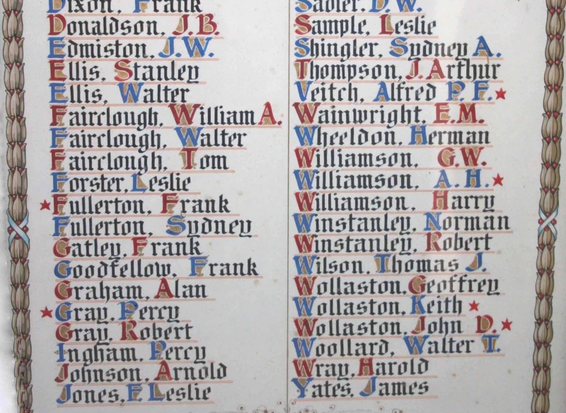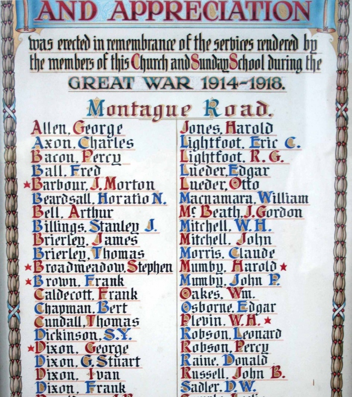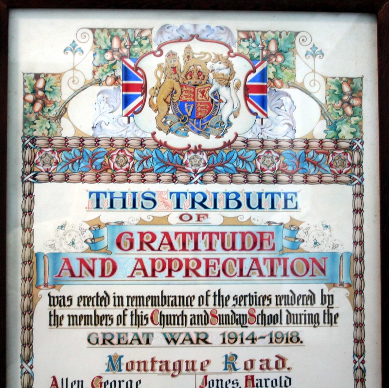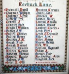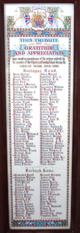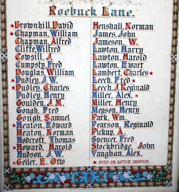 The Sale URC Sunday School Memorial was displayed up on the balcony of the Sale URC hall, until it was removed and put into storage c2000 alongside their main memorial and the Presbyterian Church Memorial. The "Roebuck Lane" section of this memorial refers to the memorial in what became the Sale Evangelical Church. Sale Congregational Church on Montague Road founded a Mission in Roebuck Lane in 1898, the building was completed in 1905. It closed in 1938 and was sold to the Sale Evangelical Church. Which accounts for the fact that the names on this memorial are the same as those listed on the Sale Evangelical Church Memorial. It is believed that Roebuck Lane must have originally returned 90ยบ and took the line of what is now Kelsall Street, joining up with Springfield Road, then a cul-de-sac. Background - In 1968, when the Sale Congregational Church on Northenden Road was closed and demolished, the remaining congregation joined with the Sale Presbyterian Church to become the Sale United Reformed Church and their War Memorial was gifted to Sale URC. This Memorial is now proudly displayed in St. Paul's P.C., Springfield Road along with their renovated main Memorial. |