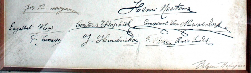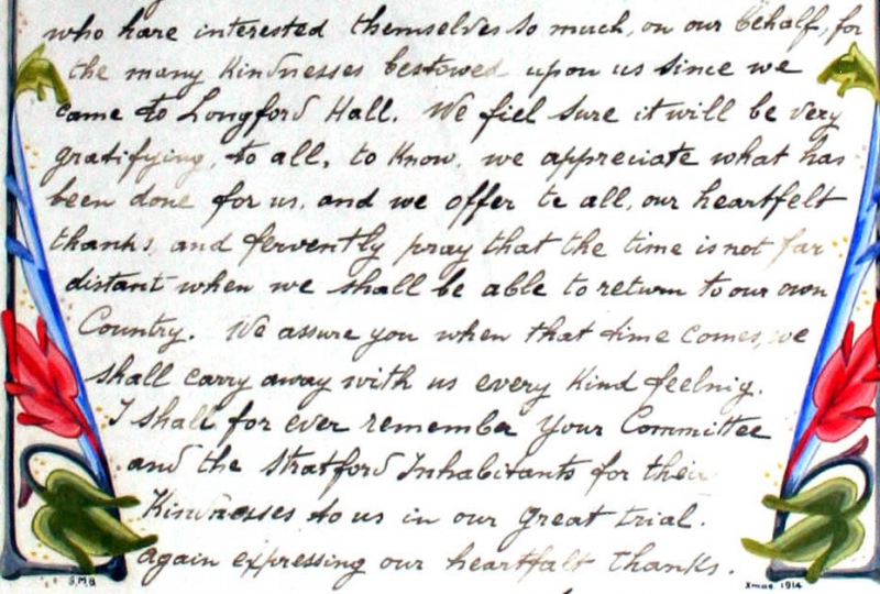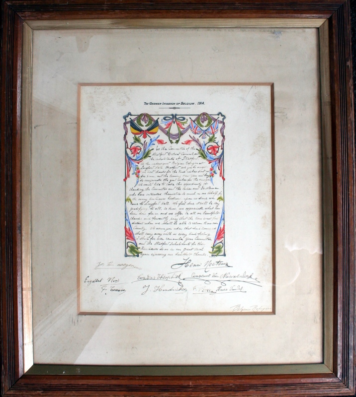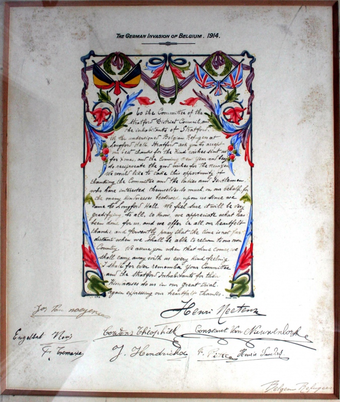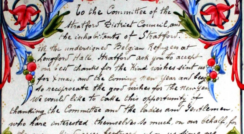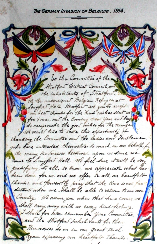 A certificate, signed by eight Belgian Refugees and dated Christmas 1914, thanking the people of Stretford for their hospitality after they had been displaced from their homeland when it was over-run by the Germans at the start of WW1. Reported in the Stretford U.D.C. Proceedings May 1914 - April 1915. Meeting of 5th January 1915. Trafford Local Studies reference Str/1/2/2/18 Page No. 420. |